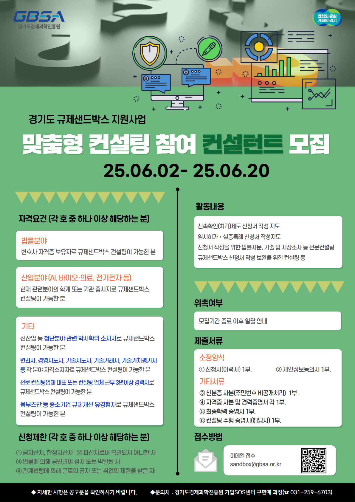 | 제목 | 2025년 경기도 규제샌드박스 맞춤형 컨설팅 컨설턴트 모집 |